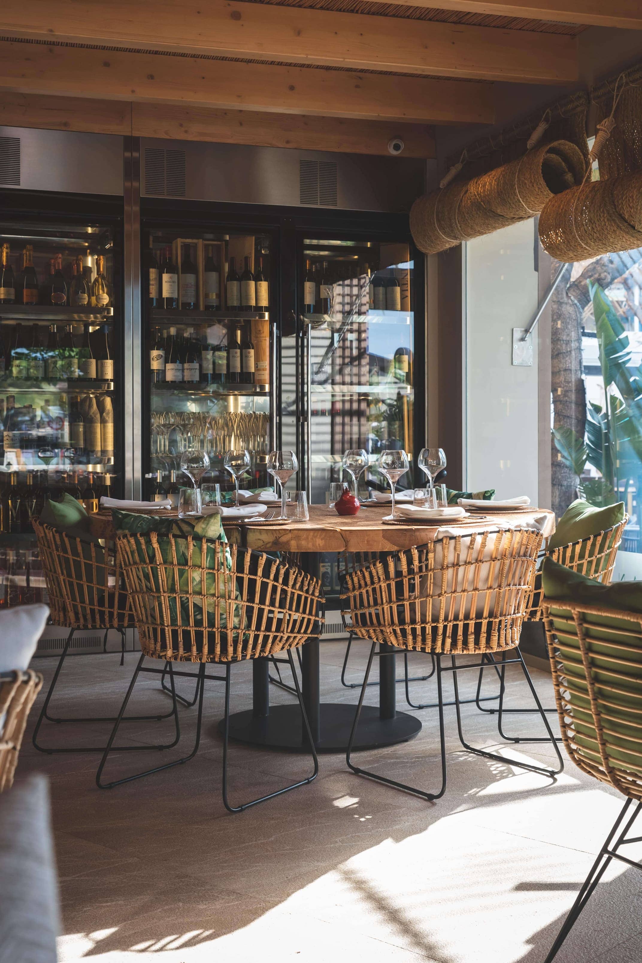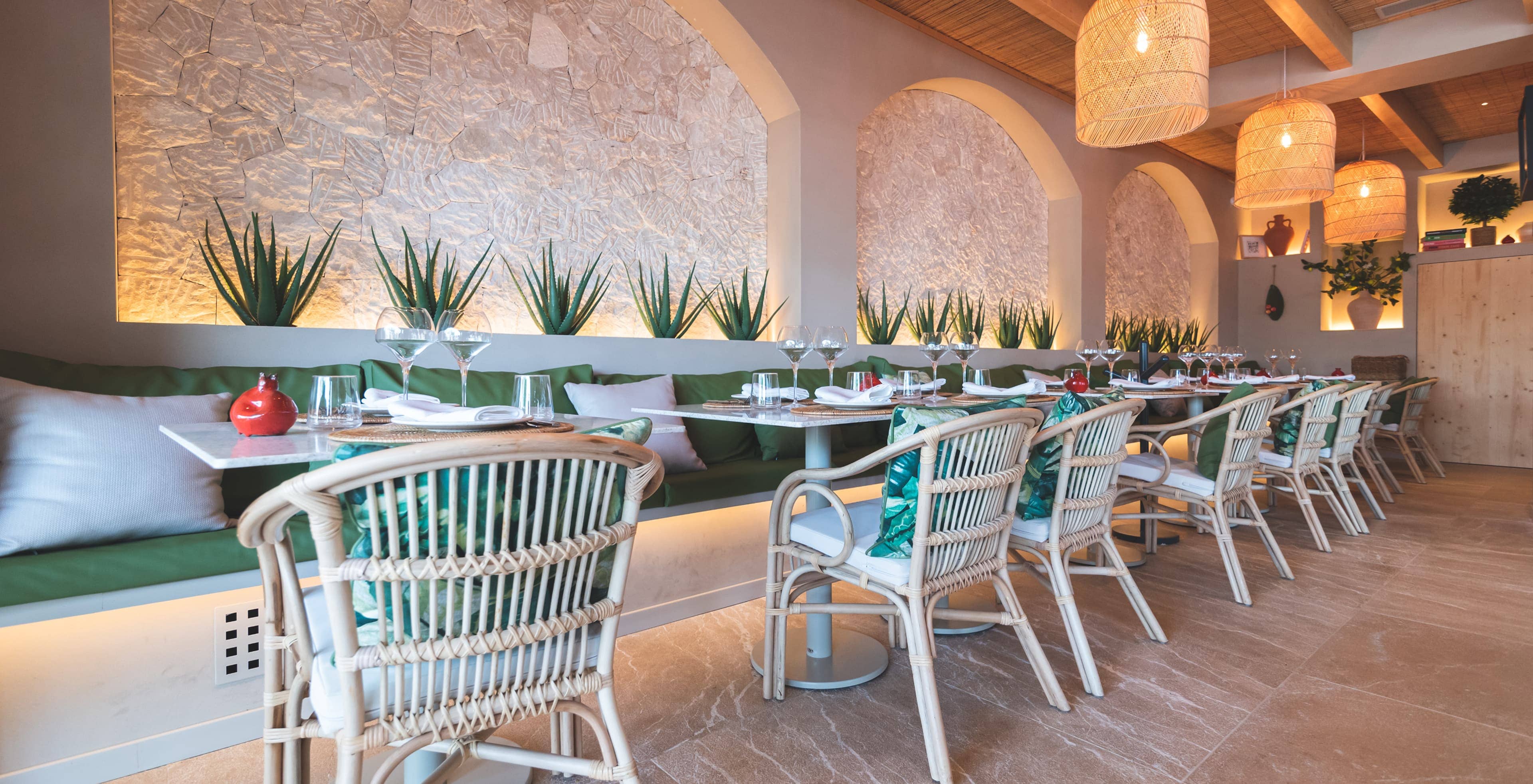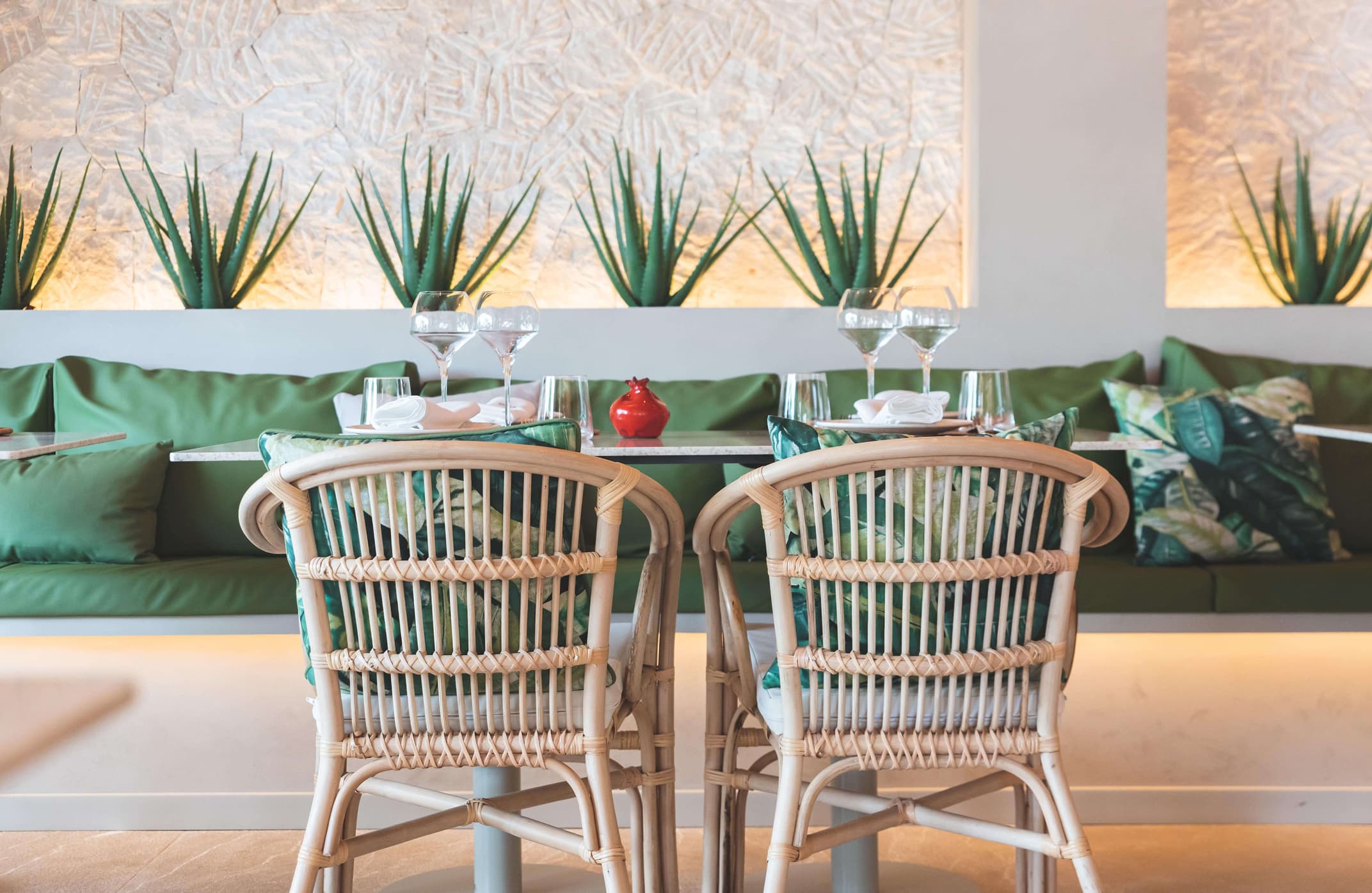 Uno de los aspectos más destacados de la decoración es el color verde, que está presente en los elementos decorativos utilizados. Este tono vibrante aviva los tonos neutros y contagia el ambiente rodeado de vida y naturaleza mientras disfrutas de tu cita gastronómica.