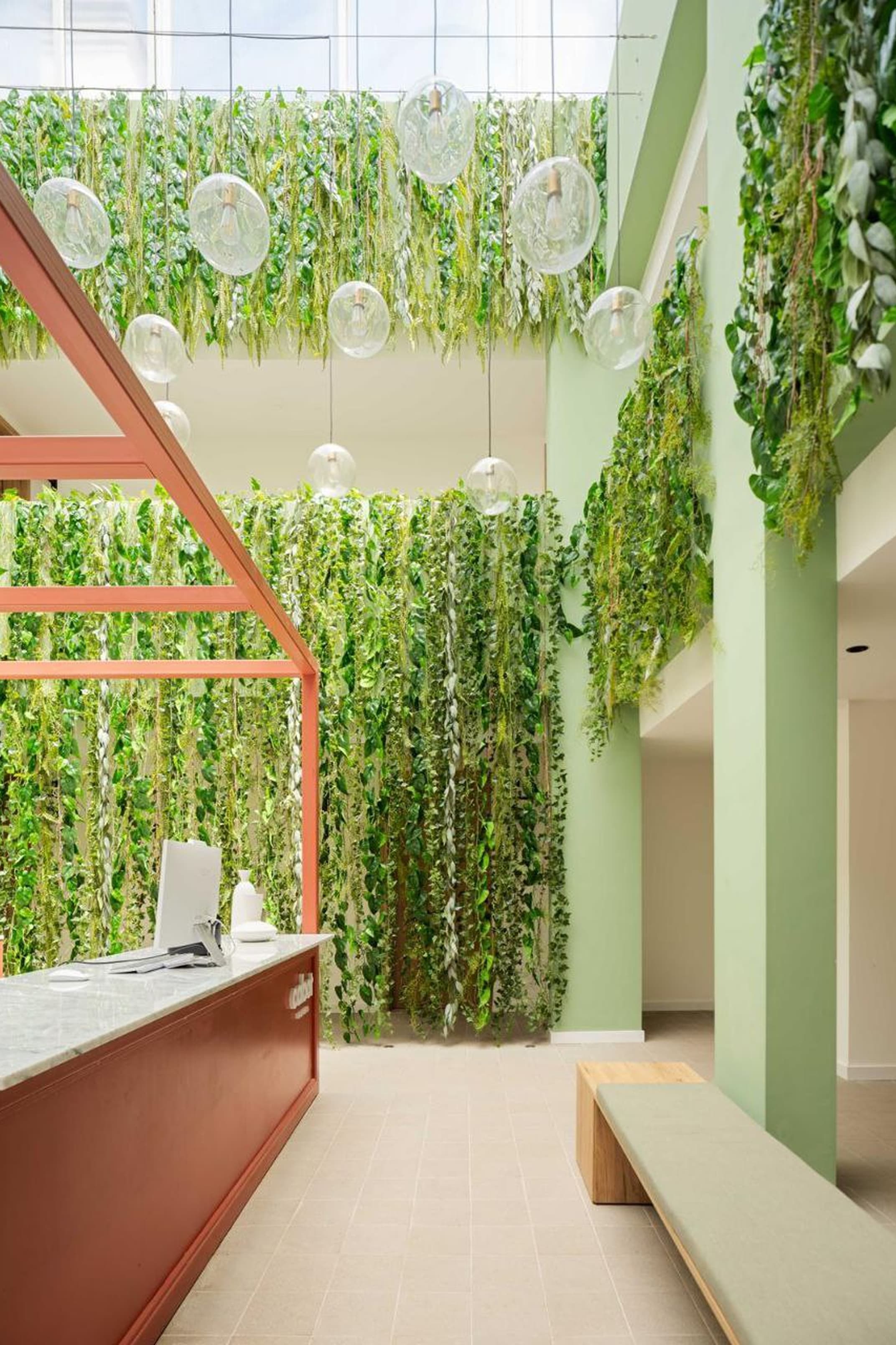Sin duda, el corazón de este proyecto es la recepción del complejo, concebida como un invernadero natural. No solo distribuye la circulación en todo el complejo, sino que también baña el espacio con una generosa entrada de luz natural. Las celosías cerámicas, además de su función decorativa, actúan como tamices, suavizando la luz que se filtra desde la recepción.