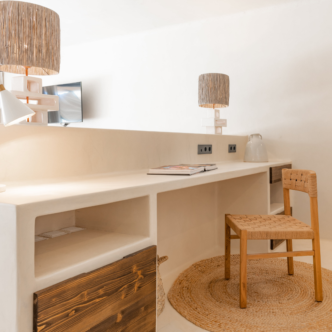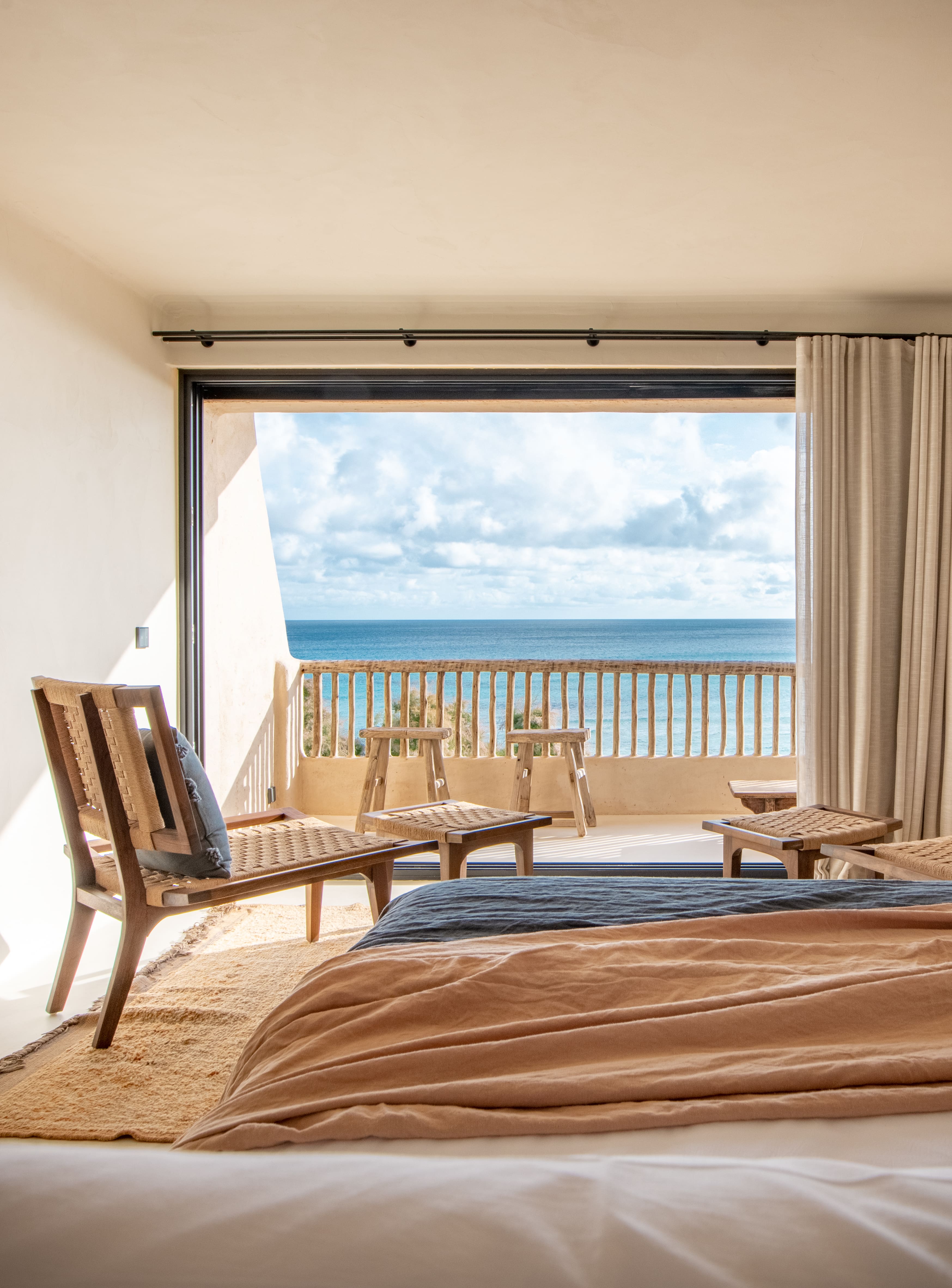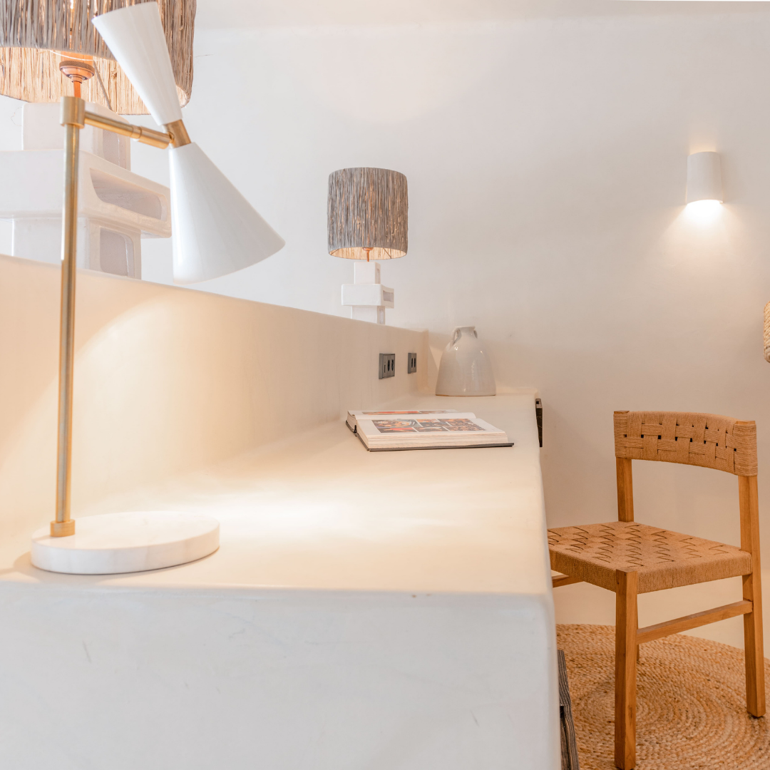 Desde la terraza de la habitación, podrás relajarte en los taburetes o en las sillas de la marca Patricia Galdón y disfrutar de las maravillosas vistas al Mediterráneo, mientras la brisa y el olor a sal se esparcen por tu rostro. La marca Patricia Galdón, también presente en el proyecto, aprovecha para presentar su nueva colección de muebles y aportar ese toque de libertad y diseño natural en los espacios.