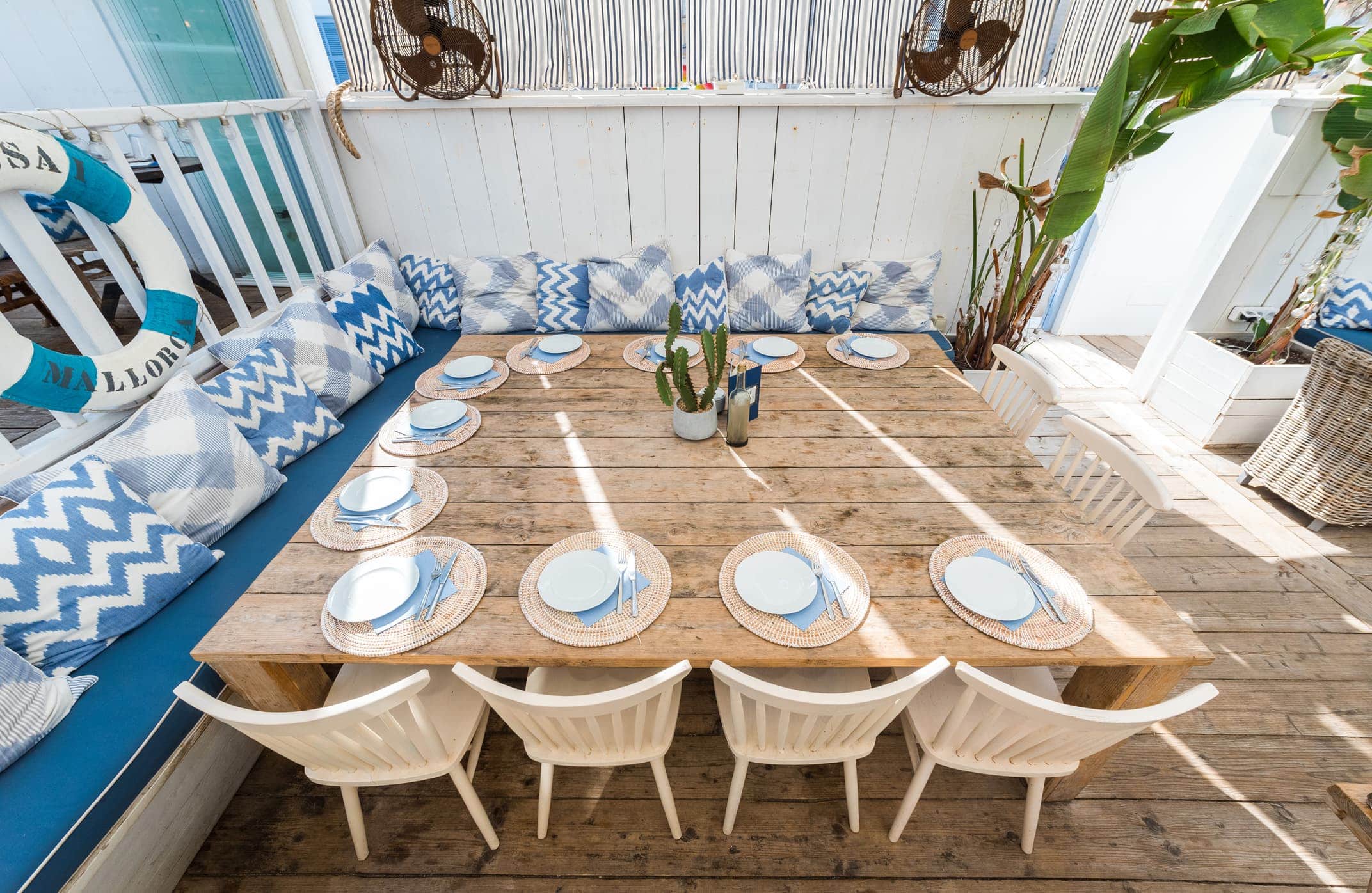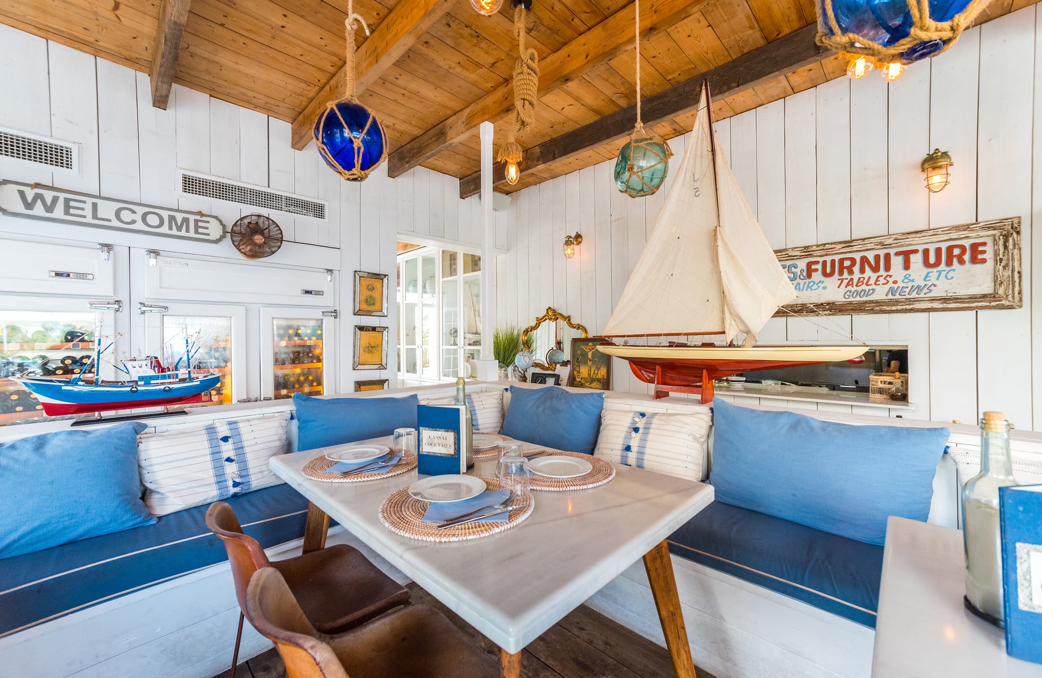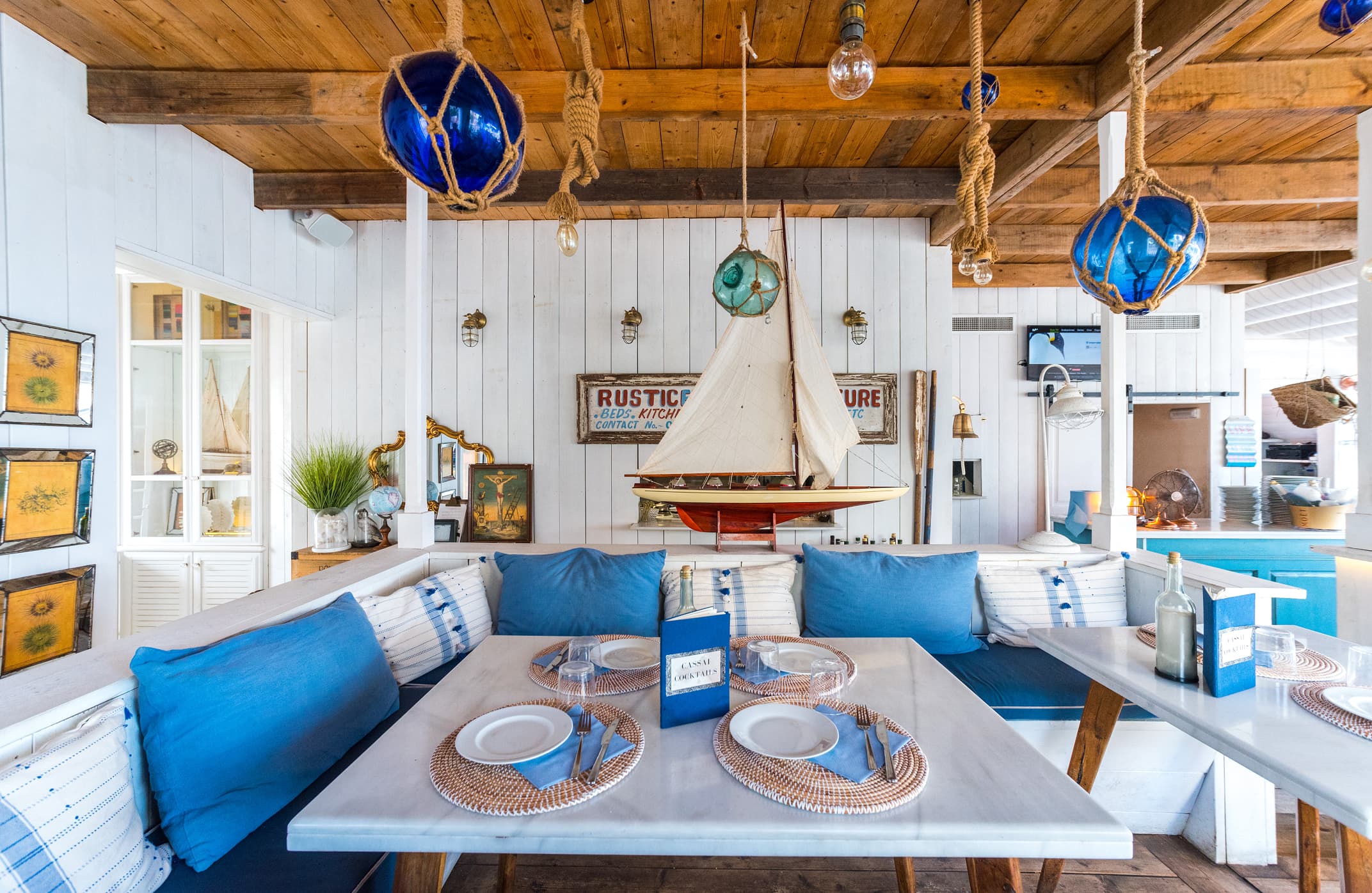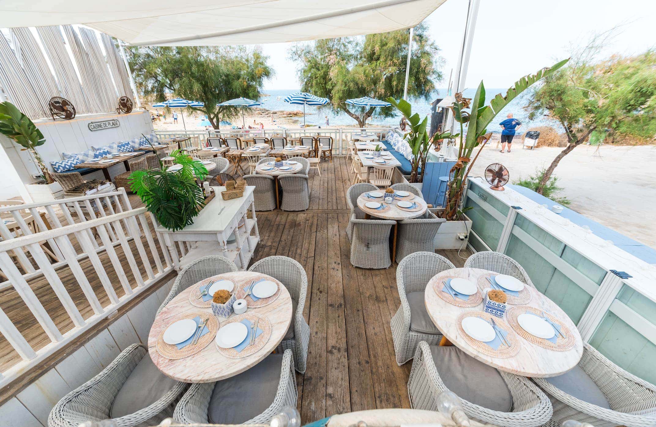 Cassai Beach mezcla el estilo provenzal romántico, con un toque hippie chic. Es un local con suelo y paredes de madera en blanco, que aportan mucha luminosidad, con muebles en tonos suaves y azules que evocan el encanto del mar.