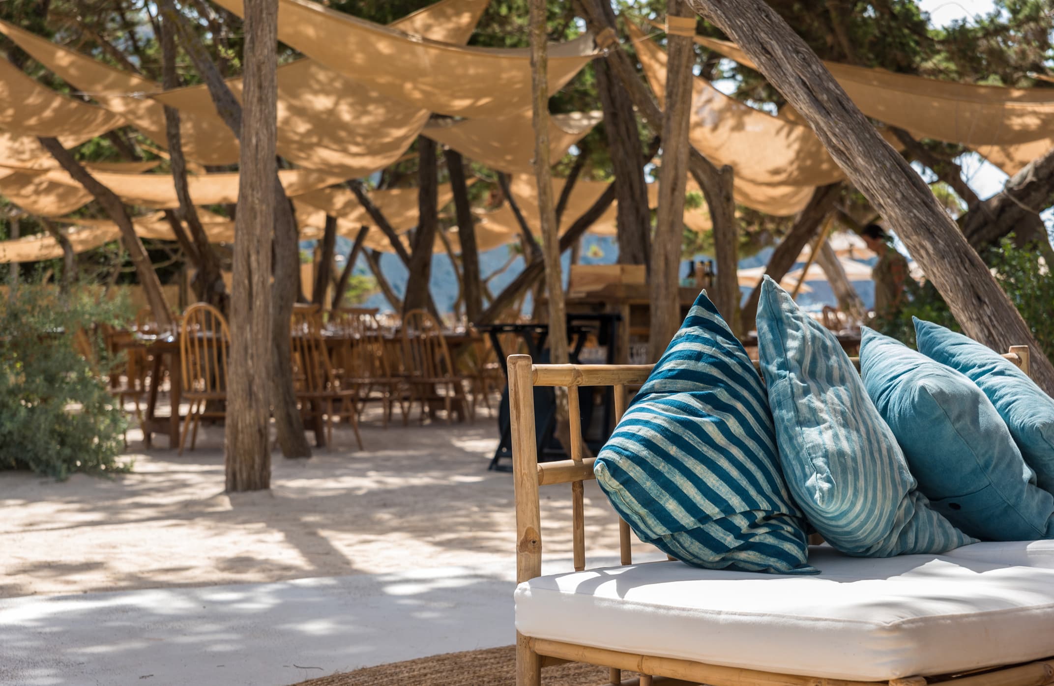 Lo primero que ves al entrar en este restaurante frente al mar es su cocina abierta, con su dinámica, ruido, olores y colores, lo que conecta inmediatamente al comensal con la gastronomía. En la terraza, la calma surge de un ambiente ligero y playero, a los pies de la típica casa ibicenca. Bajo una ‘cubierta’ compuesta por viejos árboles y ligeras velas de arpillera reposan los diseños de Dareels y muebles de bambú de TineKHome, dispuestos para el acogimiento del comensal. Las marcas exclusivas de TUO Agency también están presentes a pie de playa, donde se alarga Jondal, y desde donde es posible pedir cualquier delicia de su carta. Productos locales totalmente frescos, especialmente extraídos del mar con hasta tres cocciones distintas, respetando fielmente la esencia del producto en cada elaboración. Platos exquisitamente cocinados pero sin caer en el artificio que maridan con la carta de vinos mediterráneos y una amplia variedad de combinados y cócteles. De fondo, tan solo el sonido del mar.