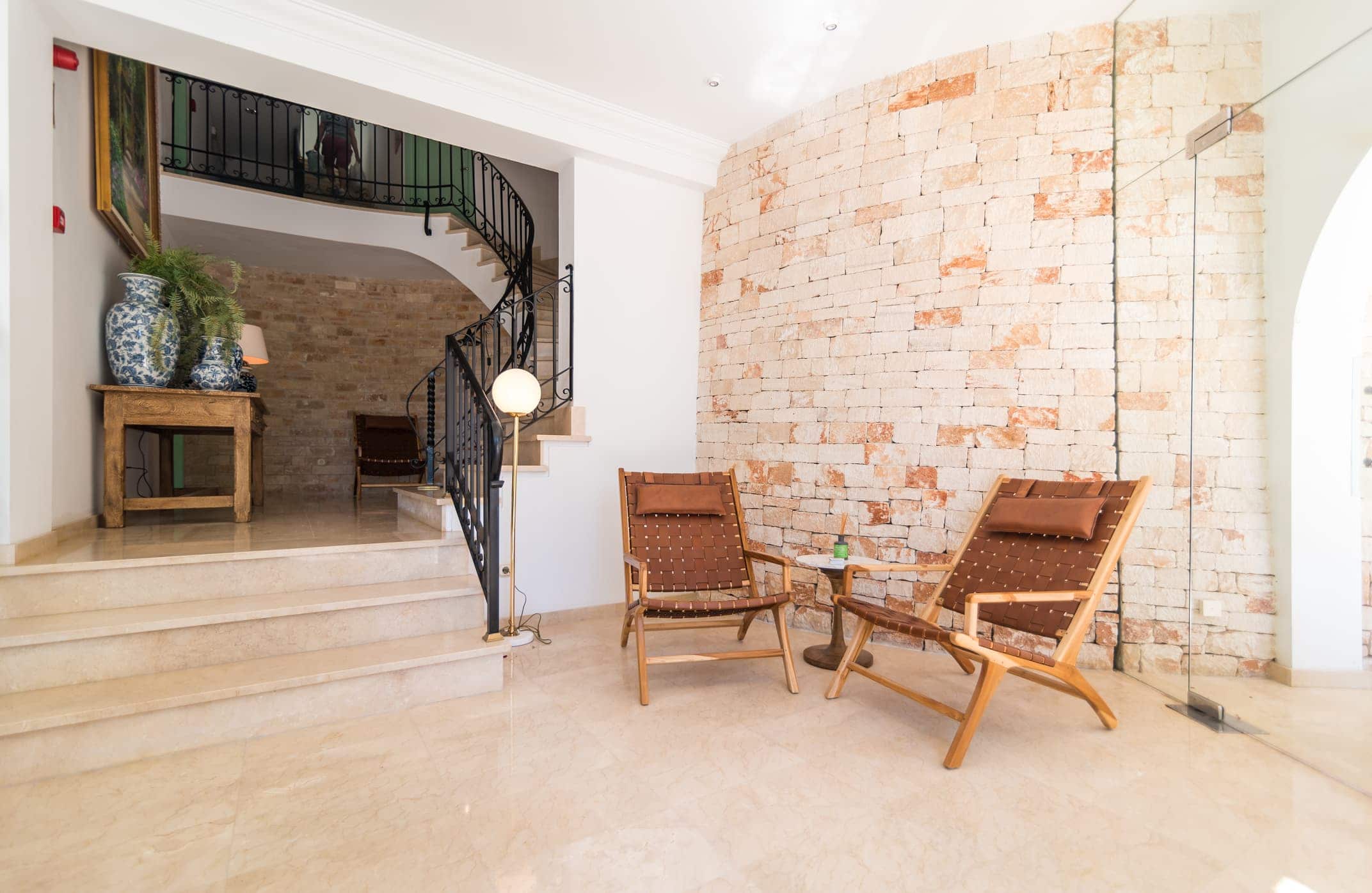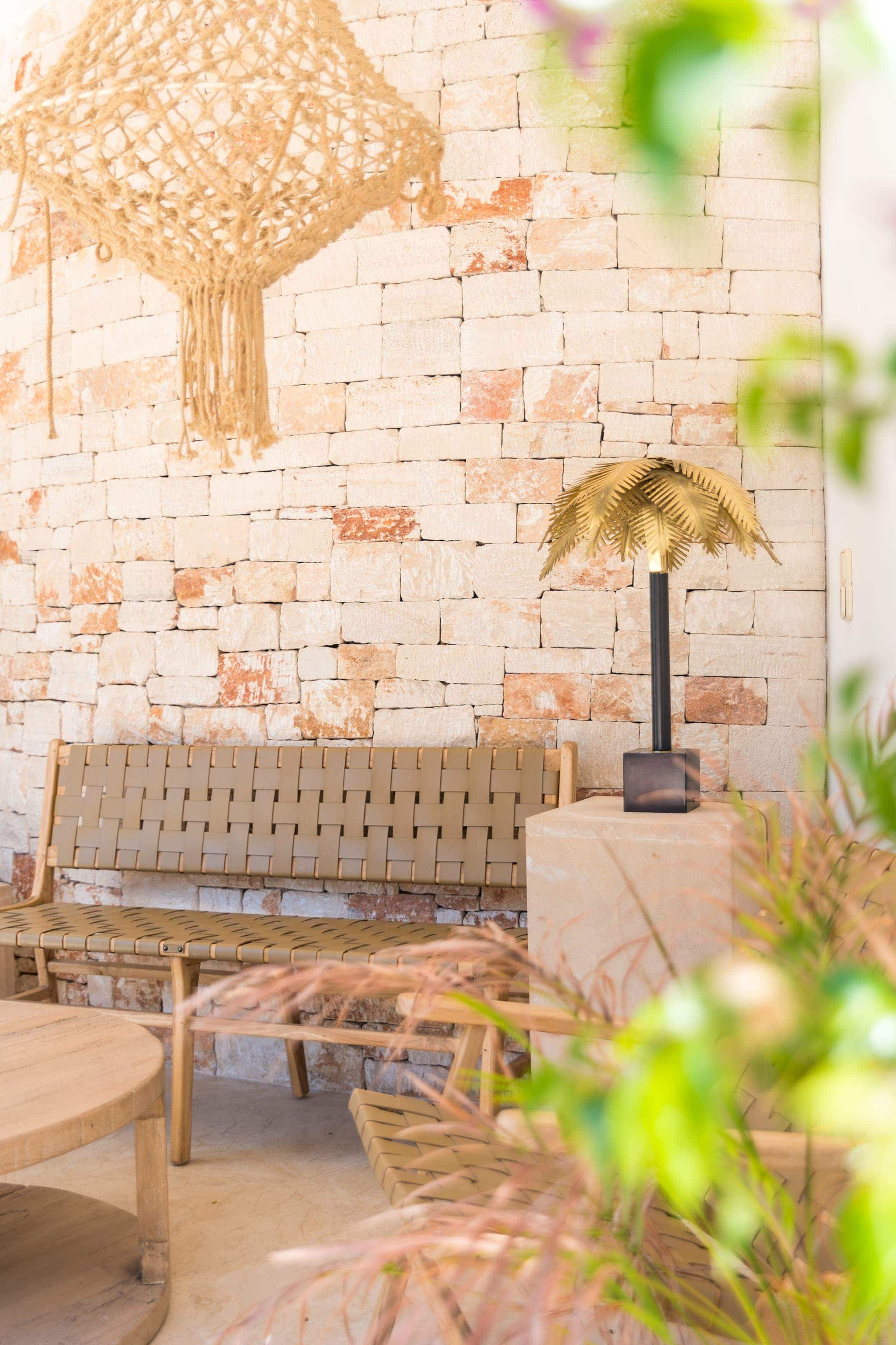 El interior de estos apartamentos de alta calidad, se caracteriza por la piedra natural y el cuidado especial de los detalles. Un diseño fresco que invita al relax en el que se ha apostado por el mobiliario de la marca española Denzzo, que firma gran parte del equipamiento del proyecto. Su estilo étnico y bohemio encaja a la perfección con el sello tan característico de los trabajos de Catalina Socias.