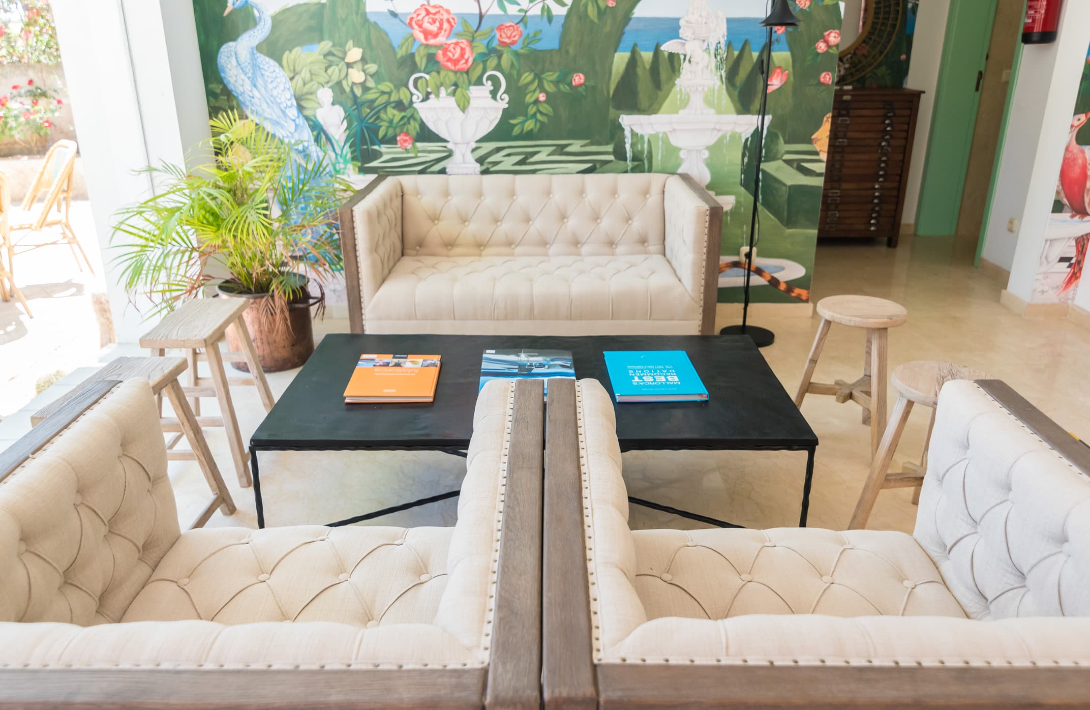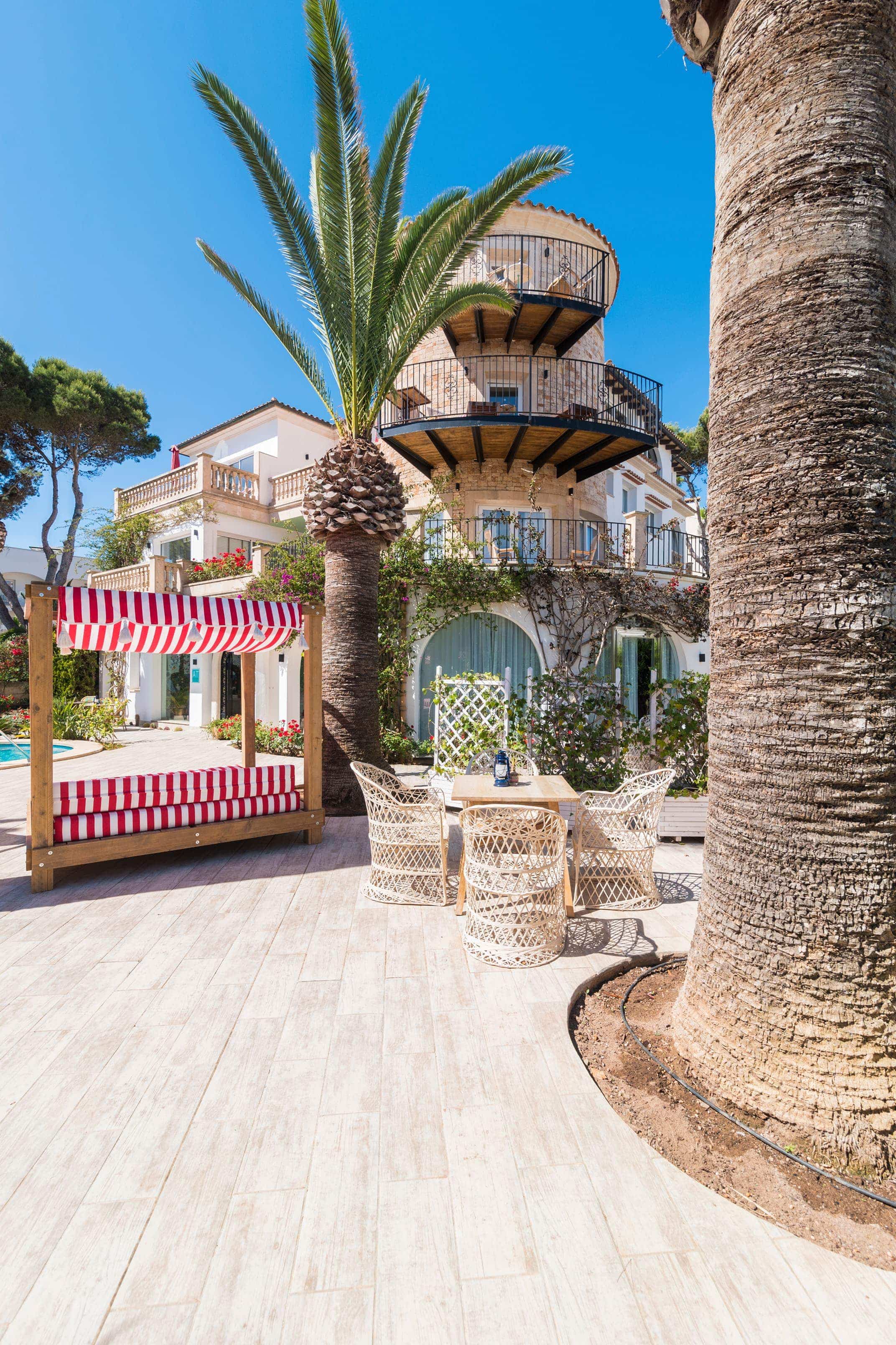 A estos elementos, se le agregan muebles como las mesas de exterior de Francisco Segarra, y accesorios de fibras naturales como lámparas, butacas de ratán y piezas vintage con colores suaves, siguiendo la línea decorativa e incrementando el encanto de cada rincón.